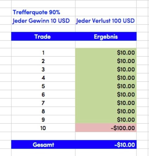 Bei diesem Beispiel ist das Ergebnis der Trades eine Trefferquote von 90%, wobei die Reihenfolge der Ergebnisse beliebig ist. Da jeder Gewinn "nur" 10 USD gross ist, der einzige Verlust allerdings 100 USD gross ist, ist das Ergebnis trotz der hohen Trefferquote negativ.