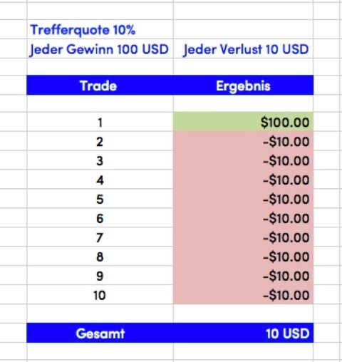 Bei diesem Beispiel ist das Ergebnis der Trades eine Trefferquote von 10%, wobei die Reihenfolge der Ergebnisse beliebig ist. Da jeder Verlust "nur" 10 USD gross ist, der einzige Gewinn allerdings 100 USD gross ist, ist das Ergebnis trotz der niedrigen Trefferquote positiv.