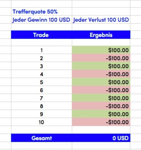 Bei diesem Beispiel ist das Ergebnis der Trades eine Trefferquote von 50%, wobei die Reihenfolge der Gewinne / Verluste beliebig ist. Da jeder Gewinn genauso gross ist wie ein Verlust, ist das Ergebnis 0 USD.