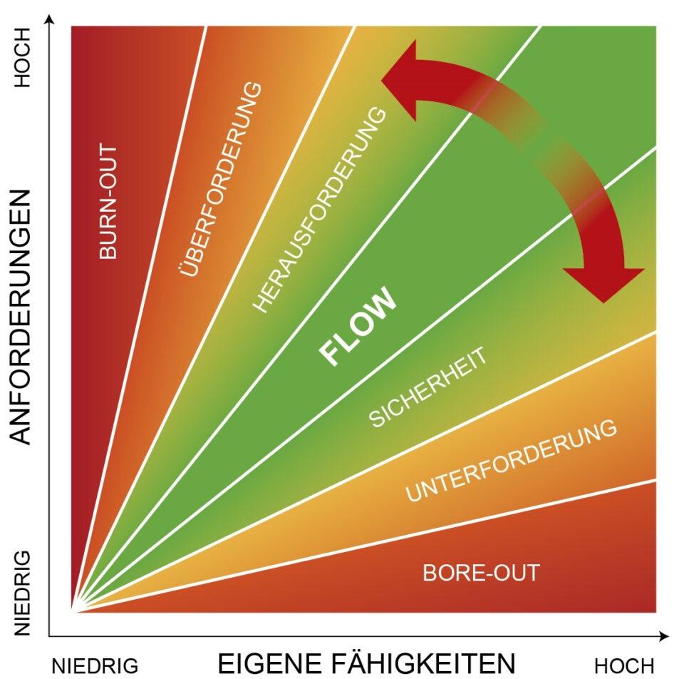 Bist Du „im Flow“? Hast Du genau den grünen Bereich in der Grafik getroffen - den Bereich zwischen Sicherheit und Herausforderung?